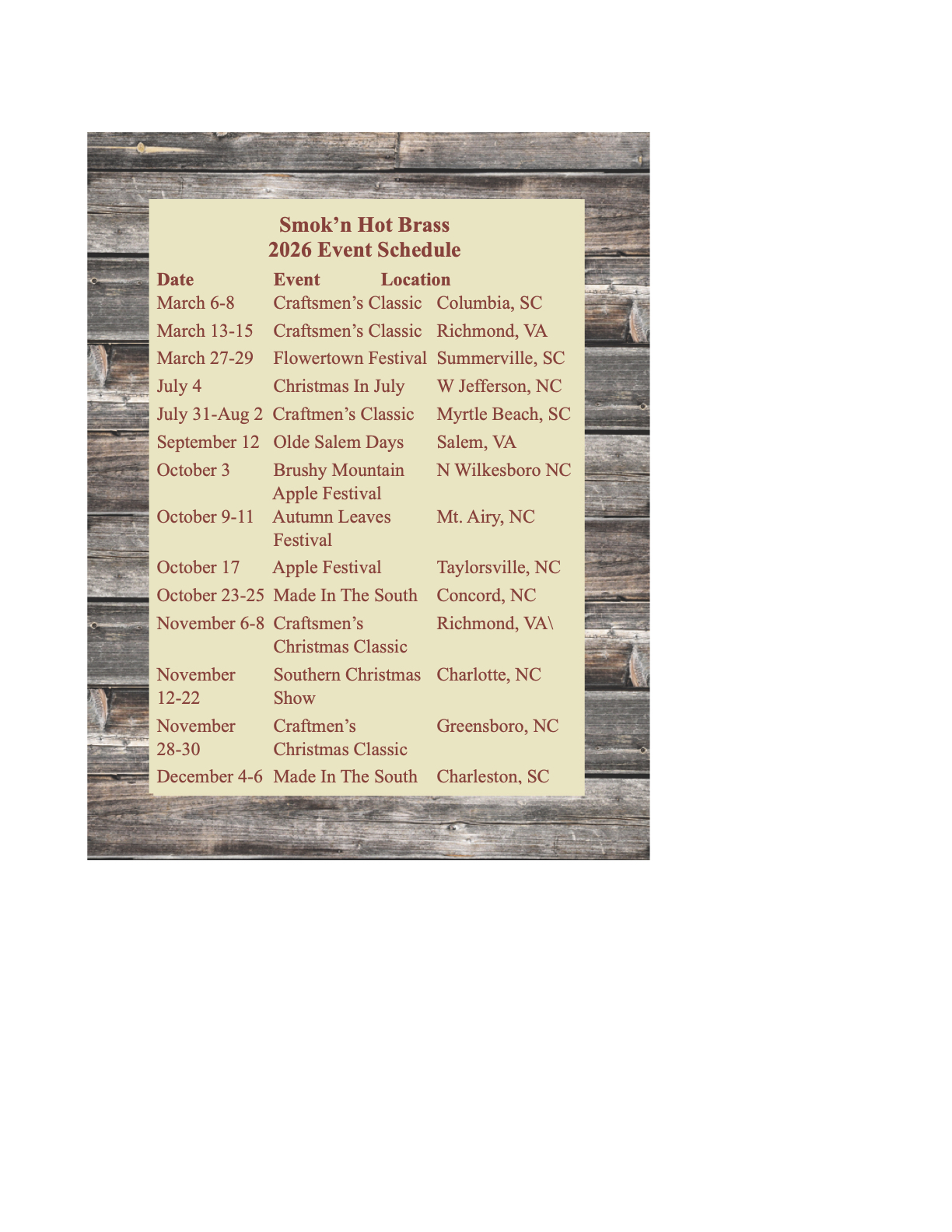 Would you like to see all of our bullet jewelry and shotgun shell jewelry in person? Smok’n Hot Brass goes to lots of festivals and arts and crafts shows throughout the year. If you are in the area we would love to see you at one of the events. If there is an event in your area that isn’t listed below, we would love to hear about it. See you at the show!